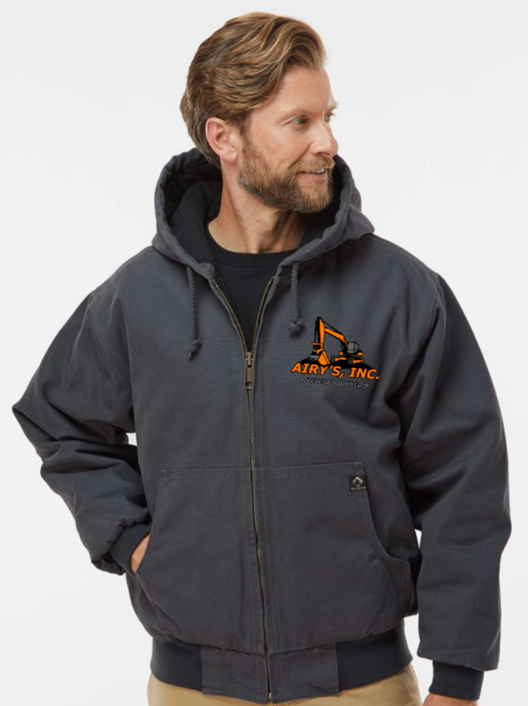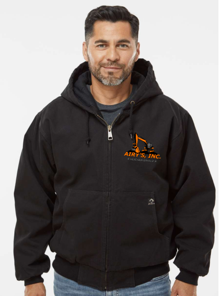 **NEW Dri Duck Cheyenne Boulder Cloth™ Hooded Jacket with Tricot Quilt Lining with embroidered Airy's Logo.   Comes in 3 colors Black, Charcoal or Brown.