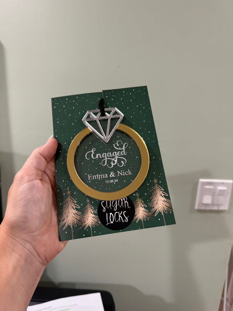This is simply stunning in person. It’s a 2 layer acrylic ornament with the clear layer laser engraved. The band shown is gold mirrored acrylic and the diamond is silver mirrored acrylic. Mirrored acrylic is so hard to take pictures of to show it’s true beauty. You can choose to have the band in gold, rose gold or platinum (silver).
